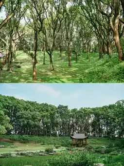 The village is surrounded by more than 20,000 camphor trees, forming a natural green barrier. The air is fresh, and the negative oxygen ion content is super high, making it a "lung-cleansing paradise" for city dwellers! You can see pomelo trees everywhere, and you can also experience the fun of picking them in the fall. The seven ponds in the village, which are high in the east and low in the west, are connected in a line to form the landscape of "Seven Stars Accompanying the Moon," which is super photogenic.