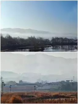 The morning sun moves to the river and the village, and there is still a thin mist.