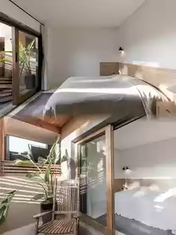 Warm hues, soft lighting, and natural wood and stone accents create a welcoming and relaxing ambiance in the guest rooms. Thoughtful touches include handmade tea sets, local teas and snacks, and a Marshall speaker for an immersive audio experience while you get ready.