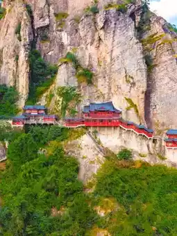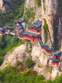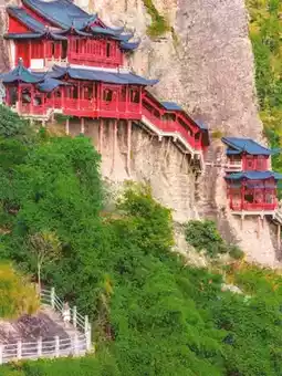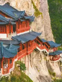 • Yuan Dynasty ancient temple suspended on a 147-meter cliff with mortise and tenon structure; the temple’s bottom pillars are thinner than a bowl’s mouth