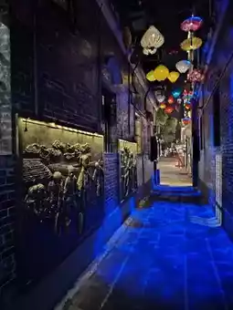 At night, Qimingli has various light shows, as well as various snack shops, small restaurants, and intangible cultural heritage streets.