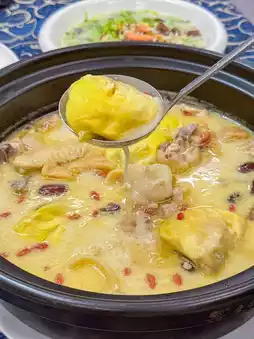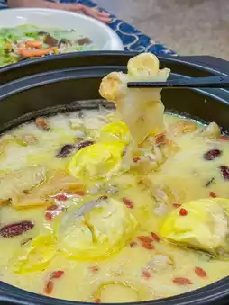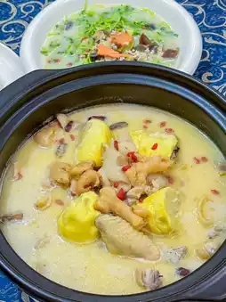 A huge pot! When the weather is cold, it's good to drink soup and eat chicken pot 🥰 Durian ➕ flower stalks are really nourishing! The durian pulp is sweet too! It is soft and glutinous when eaten after cooking!