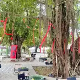 The coffee shop is near Chikan Film and Television City. It is very comfortable to sit on a bamboo bench under a big banyan tree, holding a sunflower fan, drinking coffee and eating a cake!