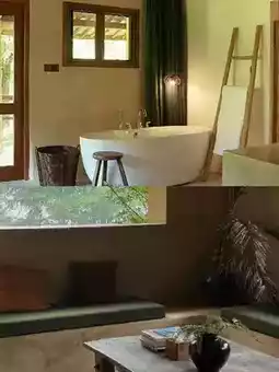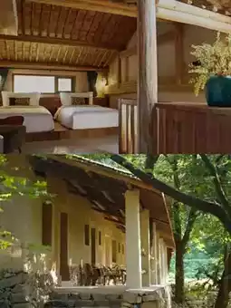 : : : : : : : : : : : : : : : Old furniture from all over the world is collected here to piece together a complete home. The rattan chairs and bamboo tables are made of agate rattan from Indonesia and made by local craftsmen in Jiangshan. The chandelier in the public area simulates the shape of white camellia, and the hanging acrylic sheets symbolize the petals of camellia
