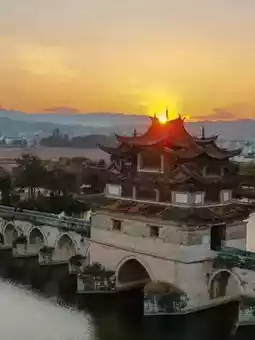 - **Shuanglong Bridge**: A 17-arch bridge stretching across the water, resembling an ink-wash painting at sunset.