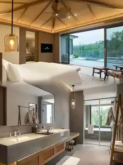 The moment you step into the hotel, you feel like you've traveled to another world. Natural elements such as wood, rattan, and green plants are everywhere, perfectly blending with the simple and modern design style to create a warm and comfortable resort atmosphere. The hotel lobby has a high ceiling design, and the sunlight shines through the huge floor-to-ceiling windows, bright and warm. The artwork and ornaments that can be seen everywhere demonstrate the hotel's taste and style.