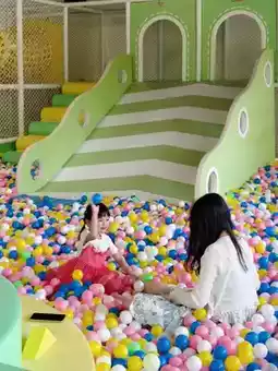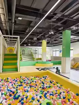 The indoor children's play area has new, clean, and complete equipment