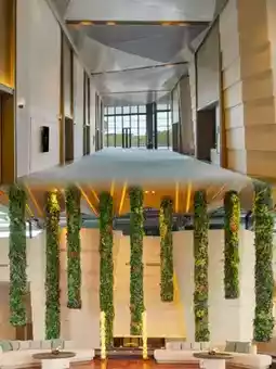 The avant-garde "Twin Waterfalls" design of MGallery Chengdu Shiyuan Waterfront Hotel breaks traditional architectural boundaries. Two main buildings cascade like waterfalls from the sky, with glass curtain walls and metal panels forming a "water curtain" that refracts ever-changing light.