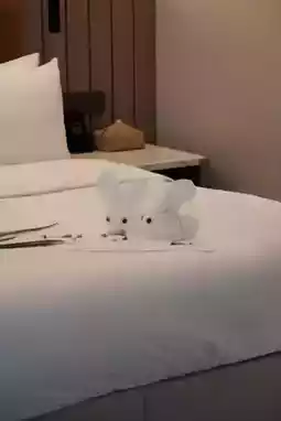 Adorable towel bunnies on bed & cloud-like bedding for heavenly sleep