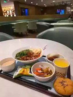 The choice of food is modest, but quite decent for a transit lounge. The main feature is the noodles that are cooked right in front of you. The cook works quickly, the noodles are hot and tasty. Plus rice, eggs cooked in different ways, several types of salads and traditional Chinese snacks.