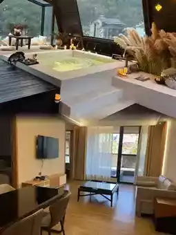 π The room balcony has a large independent private hot spring, with 24-hour hot spring water supply, and it's completely free! Pull the curtain, and it's your own private space. Soak in the hot spring while enjoying the view, it's so comfortable.