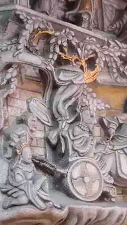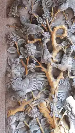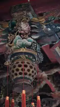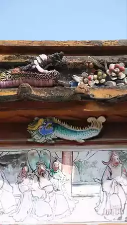 Inside the ancient temple, there are 60 exquisite three-dimensional stone relief carvings from the Qing Dynasty embedded in the walls. They are incredibly beautiful. The main hall's ceiling features a three-layered, intricately carved, gold-lacquered wooden coffered ceiling. The craftsmanship is exquisite and magnificent.