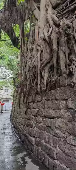 The wall in the alley is the outer wall of the Forbidden City ruins. There is moss on the large and small stones. Tall banyan trees grow on the wall, and the roots of the trees are rooted in the cracks of the stones. They have strong vitality! These three banyan trees from the Song Dynasty have become one with the city wall.