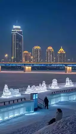 Evening: Stroll along Songhua River, enjoy the night light show (free), ice and snow sculptures by the river (winter).