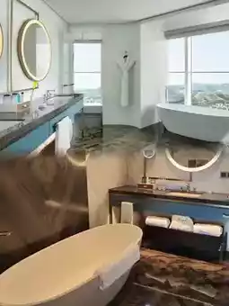 2. The guest room is very spacious, with the bathroom and bedroom each occupying half of the area. The bed is of great quality and very comfortable. The bathroom is separated into dry and wet areas and is equipped with a bathtub and a smart toilet, giving you the ultimate stay experience.