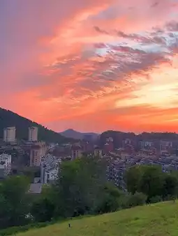 Climbing to the mountainside, the view suddenly opens up. On one side are rolling green hills with trees scattered in an orderly manner. The scenery changes with the seasons. In spring, the new green leaves and blooming mountain flowers complement each other, creating a vibrant scene; in summer, the green trees are shady, making it an ideal place to escape the summer heat; in autumn, the maple leaves are as red as fire and the ginkgo trees are golden, dyeing the mountains and forests into a colorful painting; in winter, the mountains are covered with snow, giving them a unique tranquil beauty. On the other side is a bustling city scene with high-rise buildings standing side by side and traffic flowing endlessly. The hustle and bustle of the city and the tranquility of the mountains and forests form a sharp contrast here, yet they are wonderfully integrated together.
