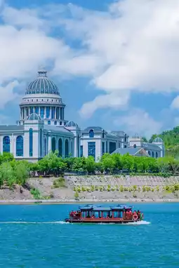 Cherry blossoms fall like snow in spring, cedar forests are dyed green in summer, autumn colors turn the reed marshes into gilded torches, and the rising mist from the lake in winter makes every morning like a dream salvaged from a fairyland.