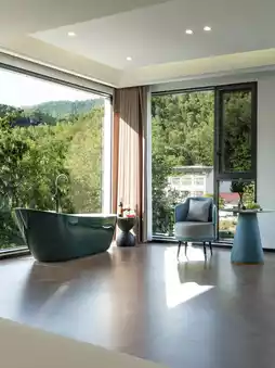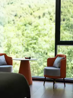 The homestay has a total of 15 guest rooms, and the floor-to-ceiling windows offer a panoramic view of the greenery of Shuimo Tingxi. In the afternoon, lie on the sofa by the window, watch the light and shadows dance waltz on the stream, and open the window to hear the concerto played by the stream.