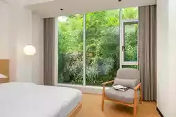 Highly recommend their twin-bed mountain view balcony room 🌄. The room is warm and inviting, with bedding that carries a faint scent of sunshine—making you never want to leave the bed! Open the curtains to a lush green panorama, with layers of mountains in the distance resembling a living landscape painting. The balcony's double lounge chairs and small tea table are the perfect finishing touch!