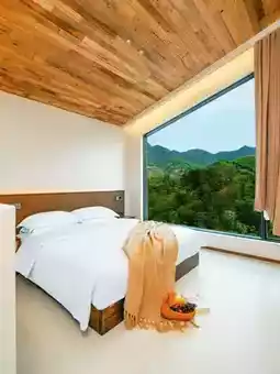 We stayed in [Yuexi], with floor-to-ceiling windows right next to the big bed, lying down you can still gaze at the mountains afar.