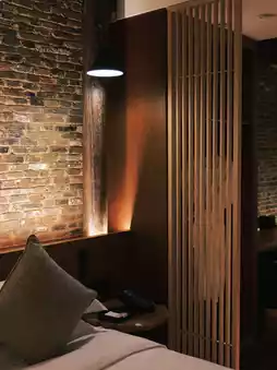 • Romance of old bricks and warm lighting: The rooms retain their original brick walls, complemented by soft lighting that wraps the weight of old architecture in warmth. Natural wood furniture adds a touch of contemporary design sophistication.