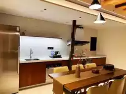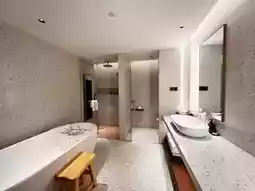Step into the villa, and the open-plan dining and kitchen area immediately captures your attention. The fusion of metal and solid wood exudes sophistication, while elegant floral arrangements add a touch of refinement. Whether hosting a small gathering with friends and family or enjoying a quiet moment alone, the ambiance is always perfect. The bathroom features textured terrazzo, a standalone bathtub, and a wet-dry separation design, showcasing meticulous attention to detail and comfort, making it the ideal place to unwind after a long journey.
