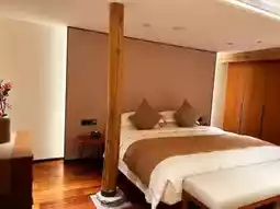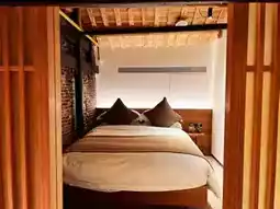 In the bedroom, ancient wooden beams coexist with modern bedding. The warm texture of natural wood paired with soft linens ensures a restful night's sleep. The highlight, however, is the double-height living room, where the grandeur of the traditional wooden roof structure is awe-inspiring. Modern sofas and vintage columns create a fascinating dialogue, making it the perfect spot to sip tea and relax, as if traveling through time yet feeling utterly at ease. There's also a hidden bedroom behind wooden lattice screens, where weathered brick walls and wooden ceilings intertwine, with every inch of space narrating the rich history of Tao Yi.