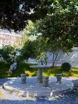A clean white small building! A courtyard lush with greenery!