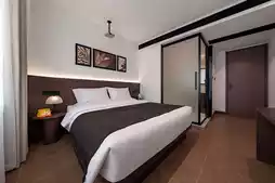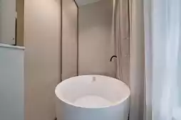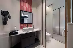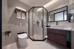 The homestay offers five room types: Modern Wind King Room, Elegant Bathtub King Room, Giant Screen King Room, Serene King Room, and Family King Room or Twin Room. These options cater to couples, ceramic art learners, and business travelers. The bathrooms feature dry and wet separation with golden accents for a touch of elegance. The shower and toilet areas are separated for convenience.