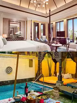 The hotel is located at the foot of the picturesque Ji Mountain, surrounded by lush tropical plants and clear streams. You can take great photos at this hotel, and it has a private infinity pool, floating afternoon tea, a Buddhist hall, an outdoor pool, and other facilities.