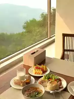 The decoration of their public areas is quite nice. The original wood color scheme is a minimalist style, and the floor-to-ceiling windows with mountain views make for great photos.