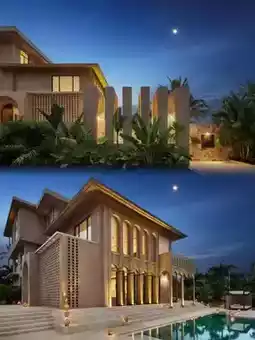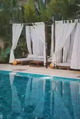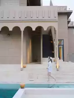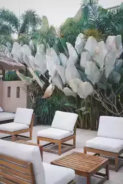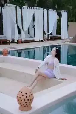 Swimming pool, green plants, villas, beach chairs, holiday atmosphere💯.