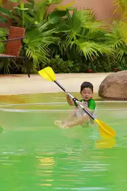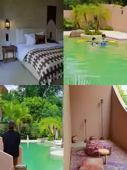 🏨The guesthouse at night was also very satisfying, with a designer style perfect for photos, and the pool here is truly amazing. The trendy transparent glass boat is perfect for photos, and Yiyi had a great time playing on the little boat~