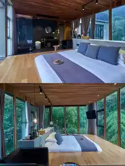 🌲 Deep in the dense forest: floor-to-ceiling windows swallow the entire rainforest, morning mist flows by your pillow;