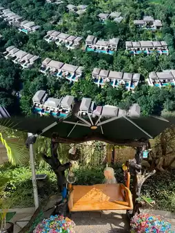 The hotel resembles a botanical garden with its own viral photo spots: dragon fruit garden, bodhi tree, banana plantation, tea garden, papaya garden, and pineapple garden. Guests can pick the ripe fruits for free! The hotel also has its own Buddhist temple.