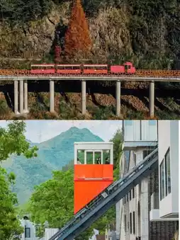 Budapest-style slanted tracks in fiery red, wedged between green cliffs—every shot looks like a movie scene!