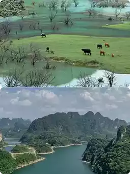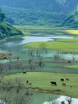 ▫️ Goose Spring Sunset 🌇: Be sure to squat for the farmer leading the cattle across the bridge at 18:30! The sunset dyes the rice fields golden, and the bamboo rafts float over the blue, glowing "glass water". Any casual shot is like an oil painting~ Remember to look down when paddling the bamboo raft, the small fish in the water will follow you 💦