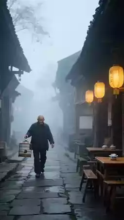an old man slowly walks by carrying a birdcage, footsteps echoing at the end of the alley—