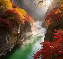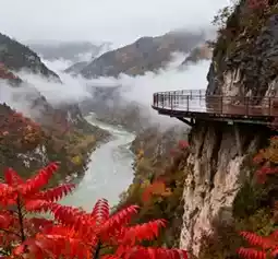2️⃣ Heigou Wonder Gorge: Stroll along the hanging plank road, watch golden ginkgo collide with dark mountain rocks, wearing Hanfu makes photos even more striking!