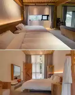 Shanhe Food Workshop: A glass restaurant by the stream, serving authentic flavors such as Jinhua Su Cakes, Buddha's Hand Health Soup, and Bamboo Forest Chicken Casserole. The ingredients are taken directly from the surrounding farms, ensuring freshness. Cliffside Coffee Shop: Hand-drip coffee with freshly baked muffins, offering a 270° mountain view. The afternoon sun shines down, making you feel like you are taking a nap in the clouds. Starry Sky Dinner: A custom candlelight dinner, accompanied by a stream and with the stars as a backdrop, the romance index is off the charts.