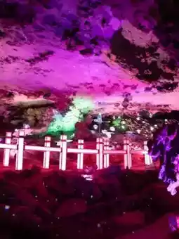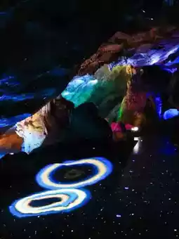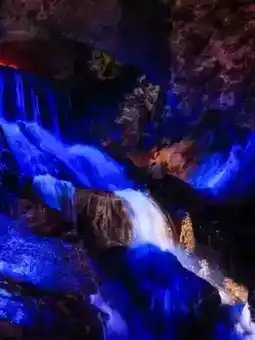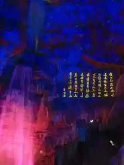 The Curling Ice Cave is connected to the Shu Long Cave, and the waterfall looks like a river of stars cascading down; 200 meters northwest of the exit, there is a winding cave called Peach Blossom Cave with purple lights and unique water and stone scenery.