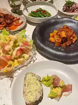 We ordered several dishes: Caesar salad, ham, garlic-infused pearl clams with olive oil, Tuscan hand-cut beef ragout pasta, and Spanish garlic shrimp – each plated exquisitely with great flavor and presentation