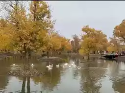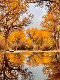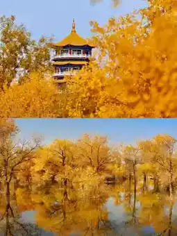 Its feature lies in the water-surrounded poplar trees in the desert (centered around Jinbo Lake), with clear water reflecting golden leaves, creating a uniquely magnificent landscape.