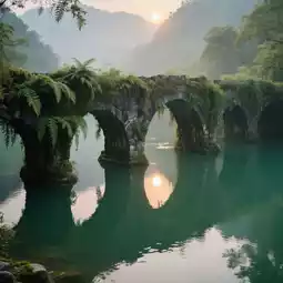 The moss-covered stone bridge casts seven arch reflections on the emerald Xiangshui River, forming a full moon. Arrive before 7 AM to witness the golden rings phenomenon: sunlight penetrates the arches, creating seven molten-gold circles on the water as Dong ethnic girls with lanterns pass by, evoking scenes of Qing Dynasty caravans.