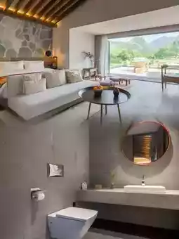 The rooms are exquisitely decorated with elegant, high-end color schemes and quality furnishings, exuding a sense of understated luxury. The bedding is incredibly soft and comfortable, like sleeping on a cloud. Panoramic floor-to-ceiling windows bring the outdoor beauty inside. Wake up to sunshine and birdsong in the morning, and drift off to sleep under the stars at night—pure bliss.