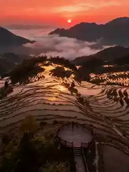 Arrive before 6:30 AM to secure front-row spots at the Jiuchu Yunhuan viewing platform, watching the first sunlight awaken the terraces. Water reflections blend with mist, and every photo is wallpaper-worthy. In the morning, stroll along the terrace trails, meet old farmers planting rice, experience farming joy, and feel the "unity of heaven and man."