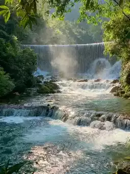 In the afternoon, visit the water forest, wading through stone crevices and woods, sunlight filtering through leaves creating light spots, just like a "secret training ground" in a fairyland martial arts drama. Finally, go to Wolong Pool, where emerald lake water overflows from the dam—every photo is a "emerald fairyland" masterpiece.