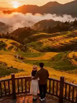 Arrive before 6:30 AM to secure front-row spots at the Jiuchu Yunhuan viewing platform. Wait with your loved one for the first sunlight to awaken the terraces. The water reflections blend with mist, and every photo is wallpaper-worthy. In the morning, stroll along the trail, meet rice-planting farmers, and feel the tranquility of "harmony between heaven and man."