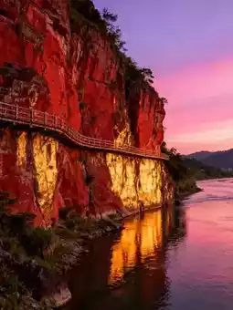 The red cliff glows golden under the sunset. Walk 200 meters along the Longgeng Road plank path to overlook the magnificent scenery where the Ou River and mountains intertwine. The plank path where Shen Li and Xing Zhi had heart-to-heart talks in the drama is here. Around 6 p.m., the sunset light bathes the cliff, making every photo atmospheric. Note: Some sections of the plank path have no guardrails, so don’t get too close to the edge when shooting.
