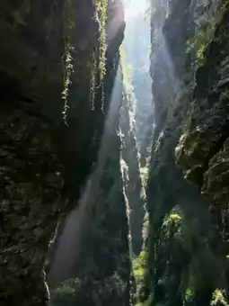 The Ada Platform glass viewing deck is a "test of courage," with emerald river water below and misty Jiudie Gorge in the distance. Hiking the "One Line Sky" path allows only one person at a time, with a "sky split in a line" view overhead. The gorge’s air is moist and fresh, rich in negative ions, making a stroll feel like lung cleansing and immortal cultivation.